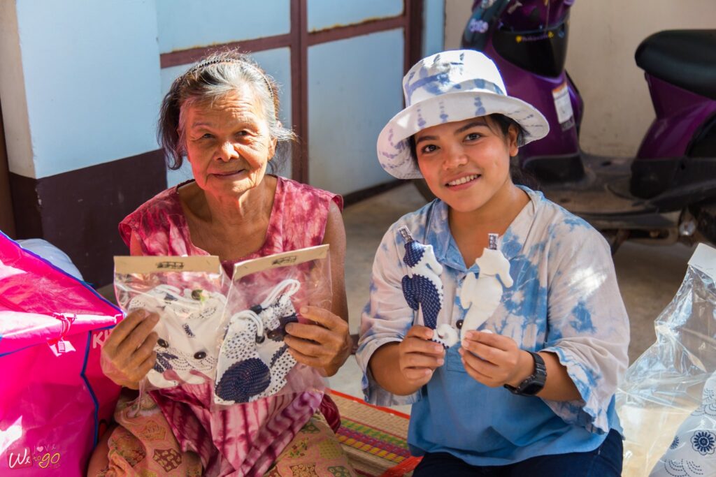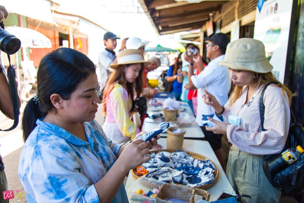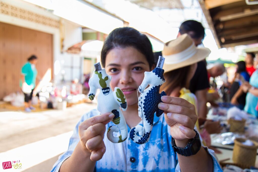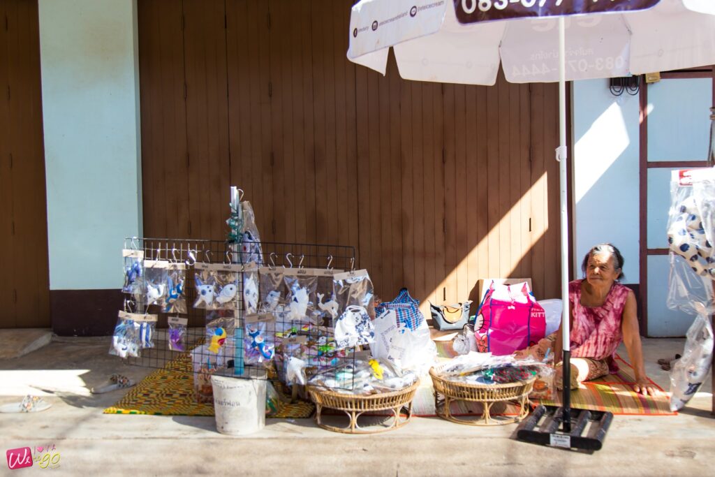 อีกหนึ่งกิจกรรมที่สนุกและน่าทำมากๆ ก็คือ ทำหมอนตุ๊กตาสัตว์ทะเล ที่มีทั้งรูปปลา ม้าน้ำ เต่า ปู ฯลฯ ที่กลุ่มแม่บ้านและผู้สูงอายุร่วมกันทำขึ้น คุณป้าเย็บผ้าขึ้นรูปเป็นตัวสัตว์ต่างๆ ไว้แล้ว เรามีหน้าที่ยัดใยสังเคราะห์เข้าไป แล้วเย็บเก็บด้ายที่ตัวตุ๊กตาเท่านั้น งานฝีมือแบบนี้ ต้องตั้งใจค่ะ ตุ๊กตาเราจะได้ออกมาสวยๆ ภูมิใจกับฝีมือตัวเอง และนำไปเป็นของฝากได้ด้วย มีทั้งแบบตัวเล็ก ตัวใหญ่ ให้เลือก หรือใครจะช่วยป้าๆ ซื้อ ช่วยอุดหนุนก็ได้นะคะ มีทำสำเร็จรูปไว้ขายด้วย