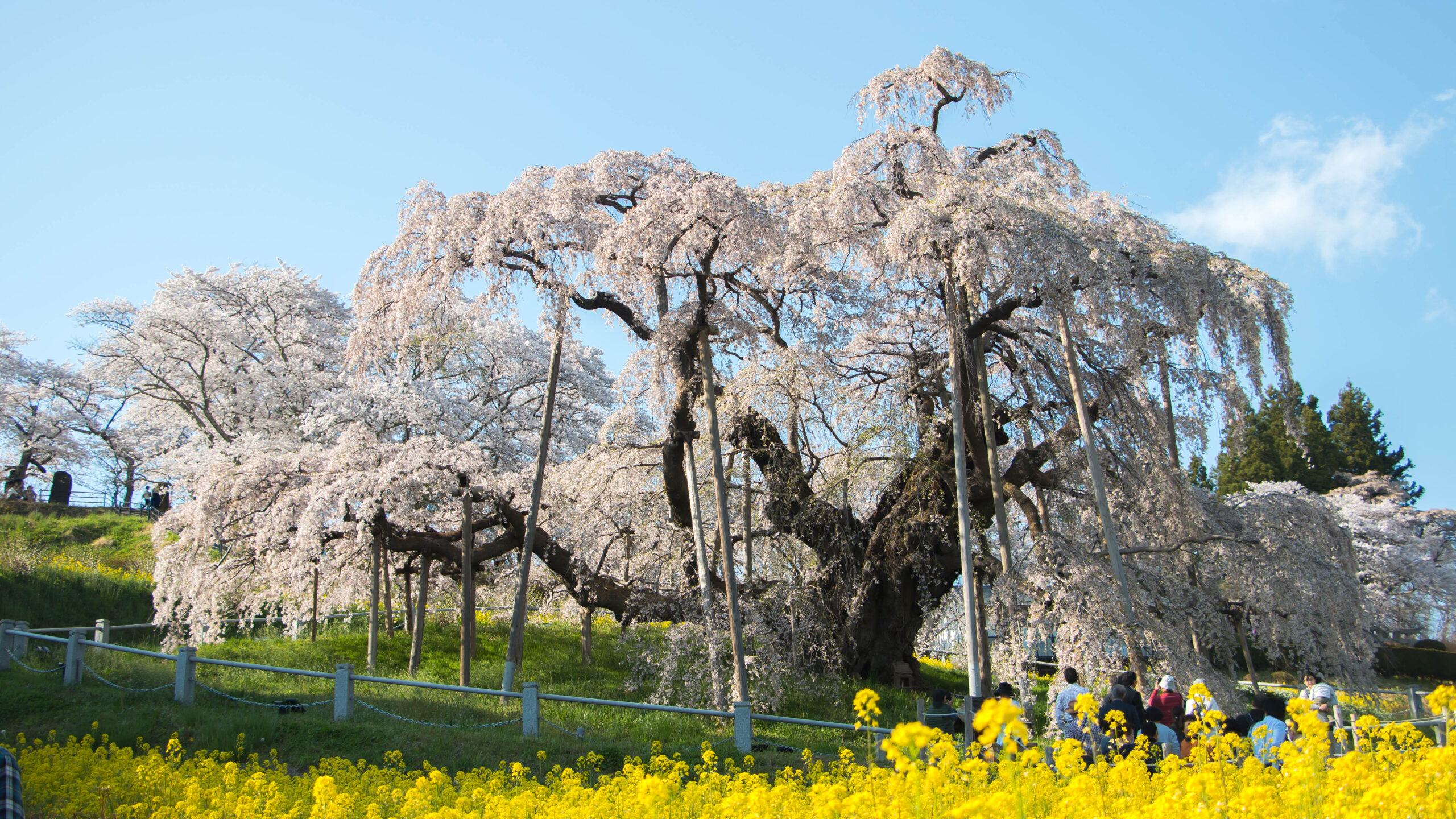 ต้นซากุระอันดับ 3 ของเราตั้งอยู่ในจังหวัดฟุคุชิมะ (Fukushima) ค่ะ เป็นซากุระสายพันธุ์ Benishidare Zakura มีอายุ 1000 ปี ความสูง 13.5เมตร เส้นผ่านศูนย์กลางทรงพุ่ม 25 เมตร แต่ถึงจะมีอายุเป็นอันดับ 3 แต่มีคนกล่าวว่าเป็นต้นไม้ที่มีความแข็งแรงที่สุดในญี่ปุ่นเลยค่ะ เพราะสามารถรอดชีวิตจากหิมะตกหนักและแผ่นดินไหวเมื่อปี 2011 มาได้ และยังได้ฉายาว่า “น้ำตกซากุระ” เพราะมีกิ่งก้านที่ย้อยลงเกือบแตะพื้น เหมือนสายน้ำที่ไหลลงมาเป็นน้ำตกค่ะ